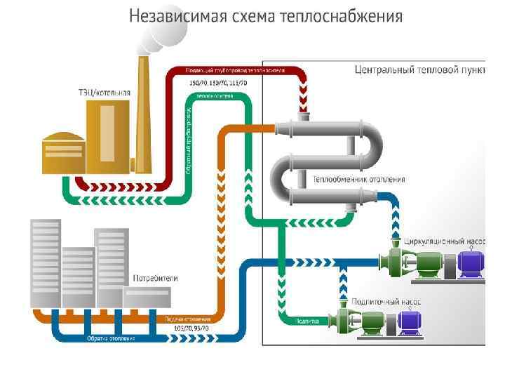 Принцип работы системы центрального отопления (СЦО): источник тепла находится вне жилых домов, а доставка теплоносителя к потребителю осуществляется по трубопроводам (подающему и обратному), которые образуют теплосети