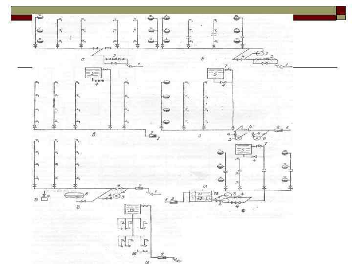 Схемы сетей внутренних водопроводов В зависимости от режима водопотребления и назначения здания, а также от технологических и противопожарных требований сети бывают тупиковыми, кольцевыми, комбинированными, зонными, а по расположению магистральных трубопроводов с нижней и верхней разводкой. Тупиковые сети применяют в зданиях, где допускается перерыв в подаче воды в случае выхода из строя части или всей сети водопровода. Это могут быть жилые, административные, а иногда и производственные здания. Кольцевые сети применяют в зданиях при необходимости обеспечения бесперебойного снабжения водой потребителей в многоэтажных зданиях), в зданиях с противопожарным водопроводом, в производственных зданиях и т. п. ). Кольцевые сети присоединяют к наружному водопроводу несколькими вводами, так что в случае отключения одного из них подача воды в здание не прекращается.