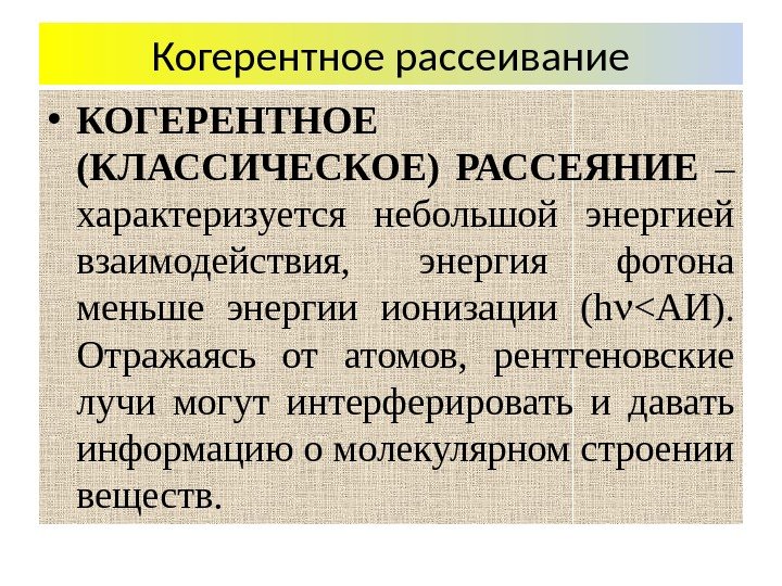 Когерентное рассеивание • КОГЕРЕНТНОЕ (КЛАССИЧЕСКОЕ) РАССЕЯНИЕ – характеризуется небольшой энергией взаимодействия, энергия фотона меньше энергии ионизации (h <АИ). Отражаясь от атомов, рентгеновские лучи могут интерферировать и давать информацию о молекулярном строении веществ.