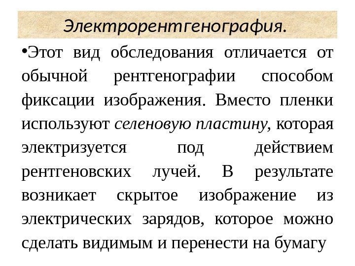 • Этот вид обследования отличается от обычной рентгенографии способом фиксации изображения. Вместо пленки используют селеновую пластину, которая электризуется под действием рентгеновских лучей. В результате возникает скрытое изображение из электрических зарядов, которое можно сделать видимым и перенести на бумагу Электрорентгенография.