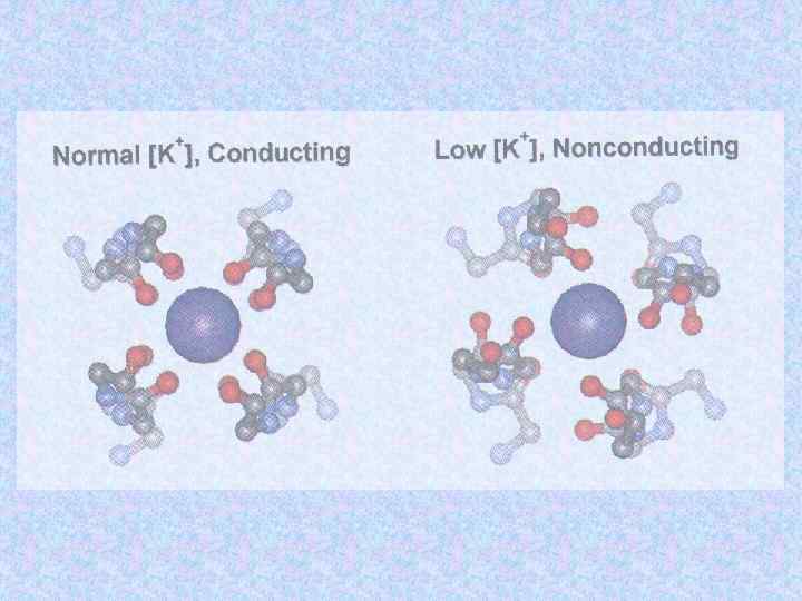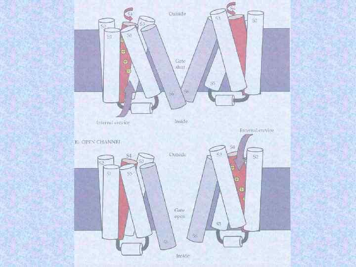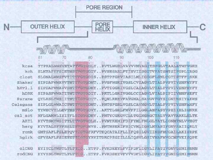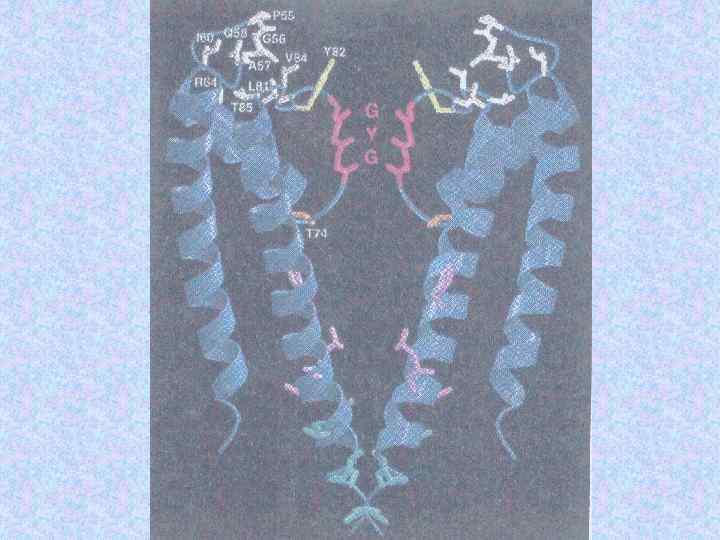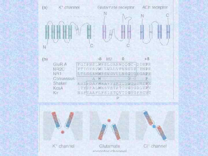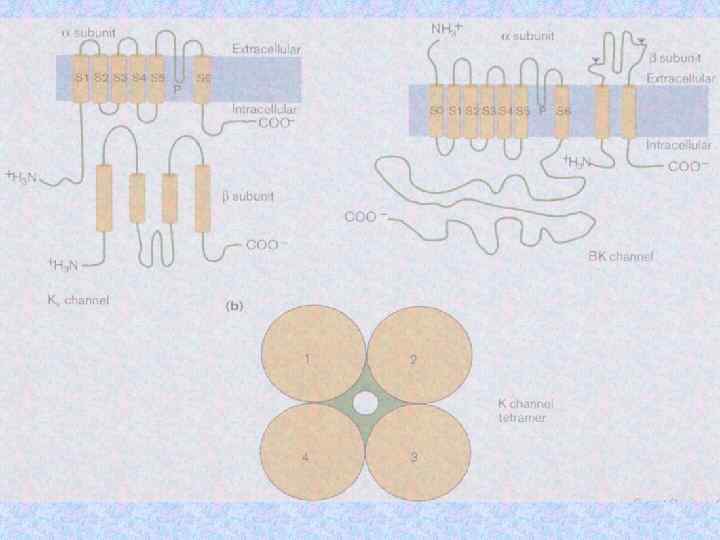 K+channel architecture All K+channels have S 5 -S 6 region The ion conduction pathway forms at the centre of of symmetric tetramer Two subunits of each of three K+channel pores are shown
