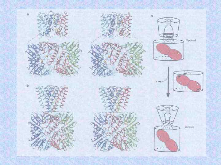 Са-активируемый К канал (Mth. K) из Methanobacterium thermoautotrophicum. Кристаллическая структура канала в (кальций связанном) открытом состоянии. Восемь RCK доменов (регуляторов калиевой проницаемости) образуют воротное кольцо на внутренней поверхности мембраны. Это воротное кольцо использует энергию связывания Са для совершения механической работы и открытия поры.