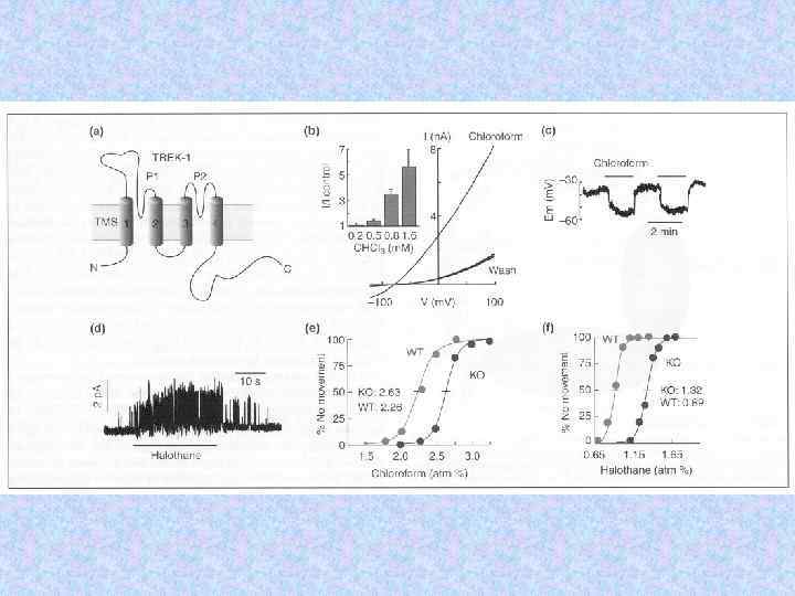 TREP K 2 P channels • Expressed highly in CNS • Activation by temperature, membrane stretch and internal acidosis • Activation by certain polyunsaturated fatty acids and lysophosholipids • Activation by volatile and gaseous anesthetics