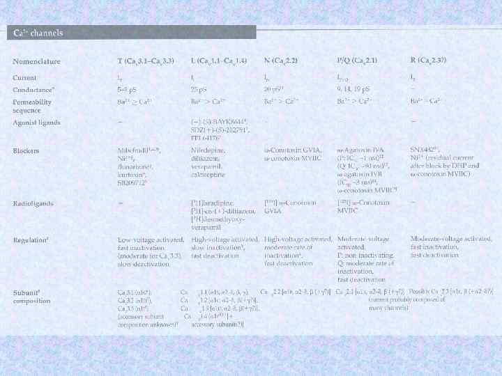 Типы кальциевых каналов Cav 1 L (long-lasting)-type inhibited by dihydropyridine Cav 2 N type not blocked by DHP, blocked by w-conotoxins Cav 2 P type blocked by w-agatoxin (low concentration) Cav 2 Q type blocked by w -agatoxin (high concentration) Cav 2 R type not blocked by DHP, w-conotoxins, w-agatoxin Cav 3 T type transient or low–voltage-activated Cav 1. 2, Cav 1. 3, Cav 1. 4 L-type Cav 2. 1 P/Q-type Ca 2. 2 N-type Cav 2. 3 R-type Cav 3. 1, Cav 3. 2, Cav 3. 3 T-type