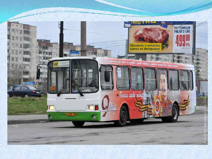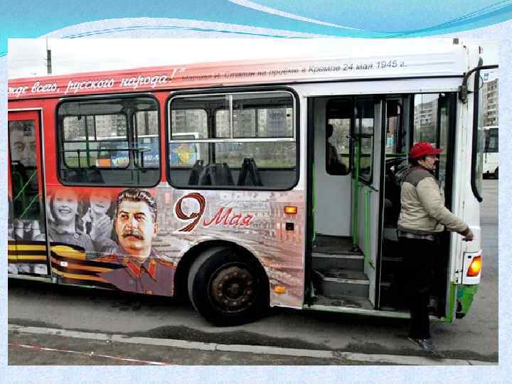 Автобусы с портретом Иосифа Сталина появились на улицах Петербурга, Волгограда и Читы 2 февраля, в день 70 -летнего юбилея победы в Сталинградской битве. "Сталинобус « бесплатно перевозил пассажиров от "Василеостровской" до Невского проспекта.