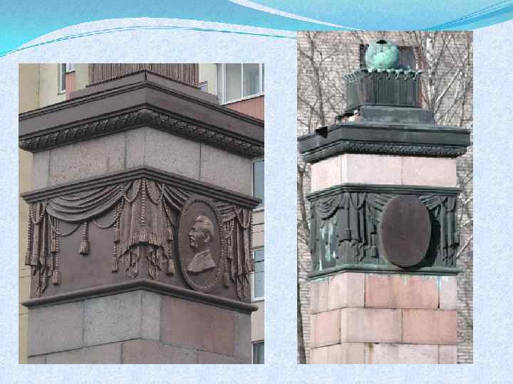 Установлены пилоны на ул. Коммуны в 1953 г. по проекту архитектора В. Душечкиной в честь подвига ленинградцев в годы Великой Отечественной войны. Вскоре барельеф Сталина был скрыт на многие десятилетия заглушкой, а ныне на розовом граните не осталось и элементов декора. Барельеф Сталину на улице Коммуны в Санкт. Петербурге. До недавнего времени был закрыт специальной планкой, но после реставрации вновь радует нас профилем Вождя.