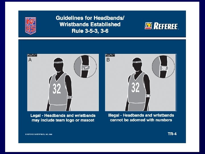 GUIDELINES FOR HEADBANDS, WRISTBANDS ESTABLISHED (3 -5 -3, 3 -6) If worn, headbands/wristbands must: § Be unadorned (except for a permissible logo). § Have only one visible manufacturer’s logo/trademark/reference OR a school logo/mascot. § Be the predominant color of the jersey or white.