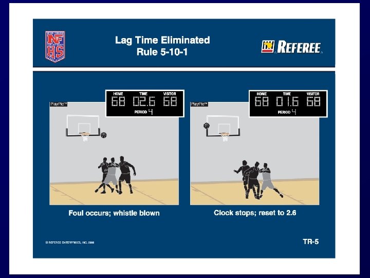 LAG TIME ELIMINATED (5 -10 -1) § § § • • Change necessary due to new clock technology and the ability to observe tenths of a second. Change eliminates need for lag time or reaction time on part of clock operator. When official has definite knowledge of time involved – correct time may be put back on game clock. Timer is not permitted to put time back on the clock, unless authorized to do so by a game official. Officials should always pay close attention to the clock whenever the clock should be stopped or started.