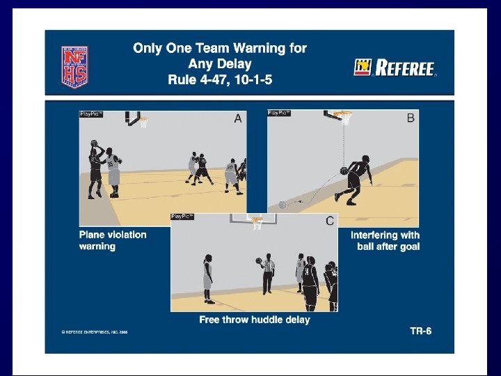 ONLY ONE DELAY WARNING PER GAME (4 -47 -4, 10 -1 -5) § Only one team delay warning issued per game for any one of four delay situations. § Any subsequent team delay in any one of the four categories will result in a team technical foul. § Change assists with flow of game and administration of rule by officials/scorers.