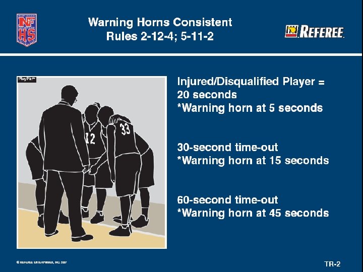 Warning Horns Changed (2 -12 -4, 5 -11 -2) • 30 -second time-out warning horn changed to be sounded with 15 seconds remaining. • Results in all warning horns to be the same – 15 seconds remaining. • Includes intermissions, time-outs and replacement interval for a disqualified or injured player.