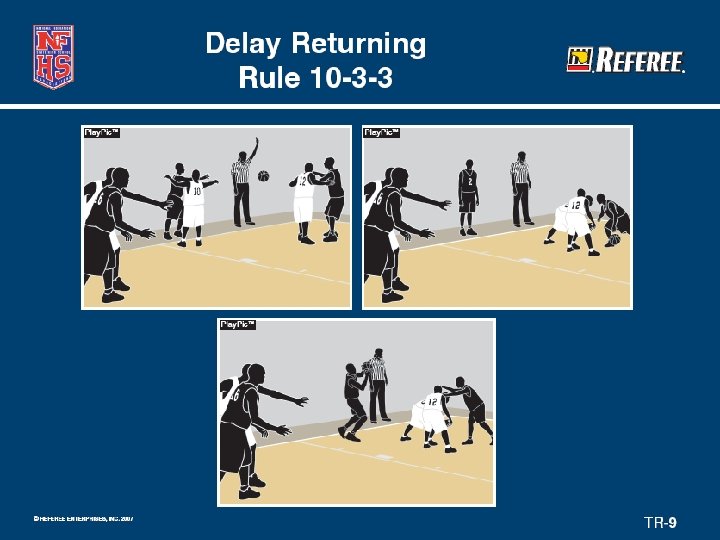 Delay Returning to Court Clarified (10 -3 -3) • Clarified that a technical foul shall be called if a player “purposefully” or “deceitfully” delays his/her return to the court after legally being out of bounds. • This includes coming back to the court after a substitution or throw-in.