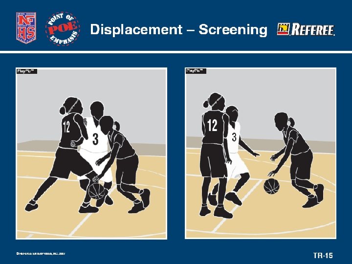 Displacement – Screening • Blind screen – outside visual field or a rear screen – only legal when screened player permitted a normal step backward. • Screened player must make attempt to get around screen without forcing rough or “displacing” contact. • If not – foul on the screened player.