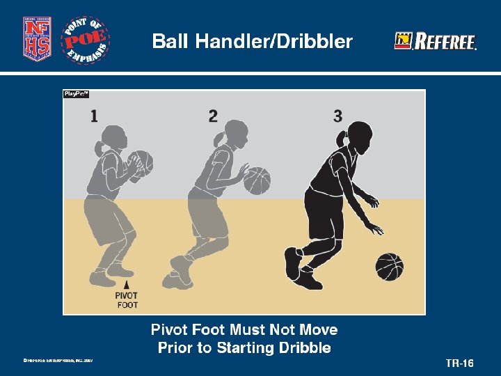 Ball Handler/Dribbler – Traveling • Only way to determine legality of those moves – first find the pivot foot. • If the player moves a foot or the feet in any direction in excess of prescribed limits – a traveling violation has occurred. • Officials must challenge themselves to improve their accuracy in this area. • Players’ skills will then improve as a result.