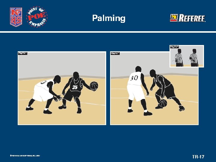 Ball Handler/Dribbler – Palming • Offensive players “palming” the ball continue to gain a tremendous advantage. • Emphasis must be given to: –Dribbler’s hand position. –Activity of the ball while the dribble is occurring.