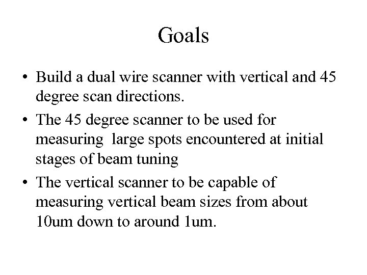 Goals • Build a dual wire scanner with vertical and 45 degree scan directions. • The 45 degree scanner to be used for measuring large spots encountered at initial stages of beam tuning • The vertical scanner to be capable of measuring vertical beam sizes from about 10 um down to around 1 um.