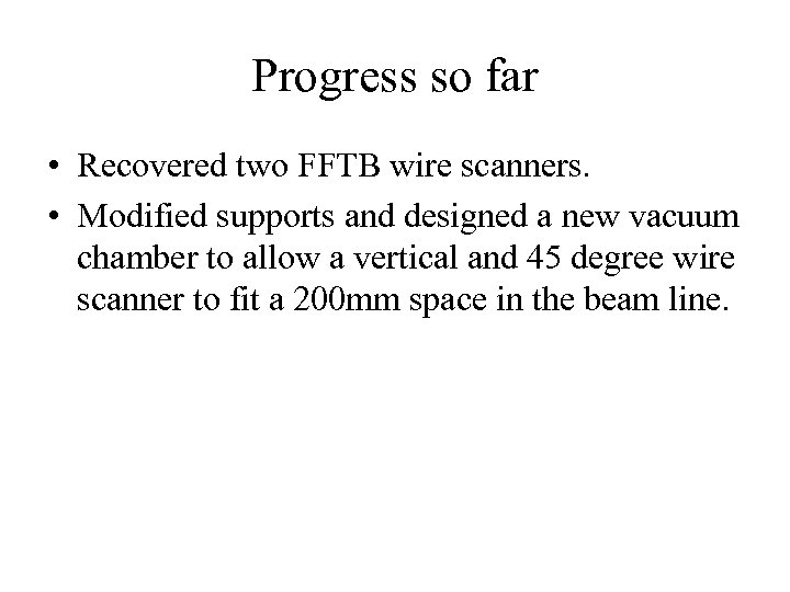 Progress so far • Recovered two FFTB wire scanners. • Modified supports and designed a new vacuum chamber to allow a vertical and 45 degree wire scanner to fit a 200 mm space in the beam line.