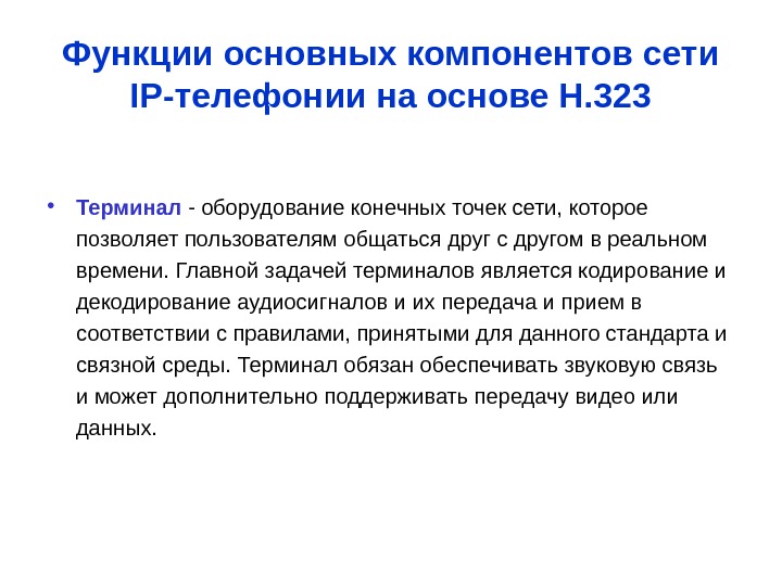 Функции основных компонентов сети IP -телефонии на основе Н. 323 • Терминал — оборудование конечных точек сети, которое позволяет пользователям общаться друг с другом в реальном времени. Главной задачей терминалов является кодирование и декодирование аудиосигналов и их передача и прием в соответствии с правилами, принятыми для данного стандарта и связной среды. Терминал обязан обеспечивать звуковую связь и может дополнительно поддерживать передачу видео или данных.