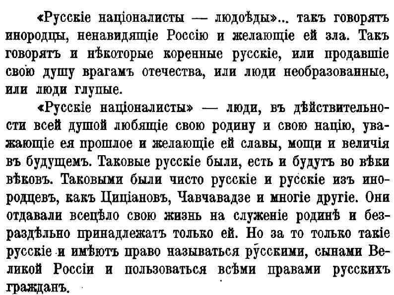 РОО и «инородцы» - Кто — русский? Все эти народы и народцы имели право на национальное чувство и его подъем; только русский национализм не признавался — его объявляли или «ремеслом и промыслом» , или «неврастенией» » . Признавая невозможность насильственного обрусения инородцев, Сергеевский отметил, что целью РОО должно стать «культурное сближение и духовное единение» всех подданных русского Царя на «почве честной преданности единому всероссийскому государству» , во всем же остальном «пусть поляк остается поляком, финляндец финляндцем и т. д. » . Инородцы, не принимающие этой программы, должны быть объявлены врагами русской государственности, считал Сергеевский, но насильственно переделывать их в русских, «мы не станем и не должны» .
