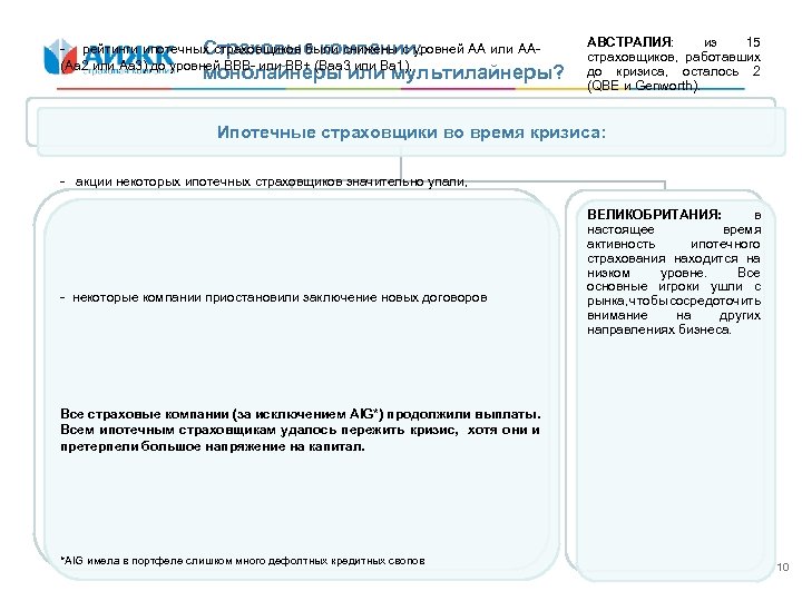 - рейтинги ипотечных страховщиков были снижены с уровней AA или АА- Страховые компании: (Аа 2 или Аа 3) до уровней ВВВ- или ВВ+ (Ваа 3 или Ва 1), монолайнеры или мультилайнеры? АВСТРАЛИЯ: из 15 страховщиков, работавших до кризиса, осталось 2 (QBE и Genworth). Ипотечные страховщики во время кризиса: - акции некоторых ипотечных страховщиков значительно упали, - некоторые компании приостановили заключение новых договоров ВЕЛИКОБРИТАНИЯ: в настоящее время активность ипотечного страхования находится на низком уровне. Все основные игроки ушли с рынка, чтобы сосредоточить внимание на других направлениях бизнеса. Все страховые компании (за исключением AIG*) продолжили выплаты. Всем ипотечным страховщикам удалось пережить кризис, хотя они и претерпели большое напряжение на капитал. *AIG имела в портфеле слишком много дефолтных кредитных свопов 10