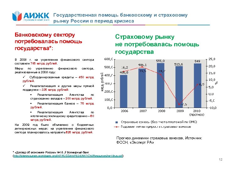 Государственная помощь банковскому и страховому рынку России в период кризиса Банковскому сектору потребовалась помощь государства*: Страховому рынку не потребовалась помощь государства В 2008 г. на укрепление финансового сектора составили 785 млрд рублей. Меры по укреплению финансового реализованные в 2008 году: сектора, ü Субординированные кредиты – 450 млрд рублей. ü Рекапитализация и другие меры прямой поддержки – 335 млрд рублей: • Рекапитализация Агентства по страхованию вкладов – 200 млрд рублей. • Рекапитализация банков – 75 млрд рублей. • Рекапитализация Агентства по ипотечному жилищному кредитованию – 60 млрд рублей. На 2009 год было объявлено о бюджетных антикризисных мерах: на укрепление финансового сектора планировалось направить 625 млрд рублей. Прогноз динамики страховых взносов, Источник: ФССН, «Эксперт РА» * «Доклад об экономике России» № 18 // Всемирный банк (http: //siteresources. worldbank. org/INTRUSSIANFEDERATION/Resources/rer 18 rus. pdf) 12