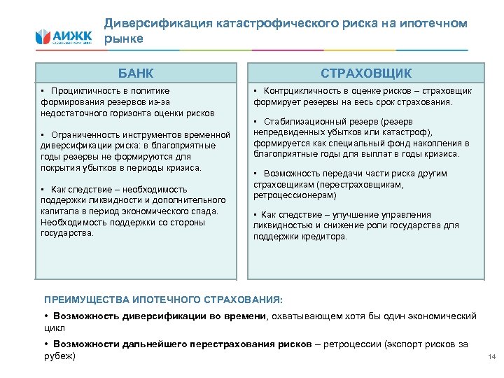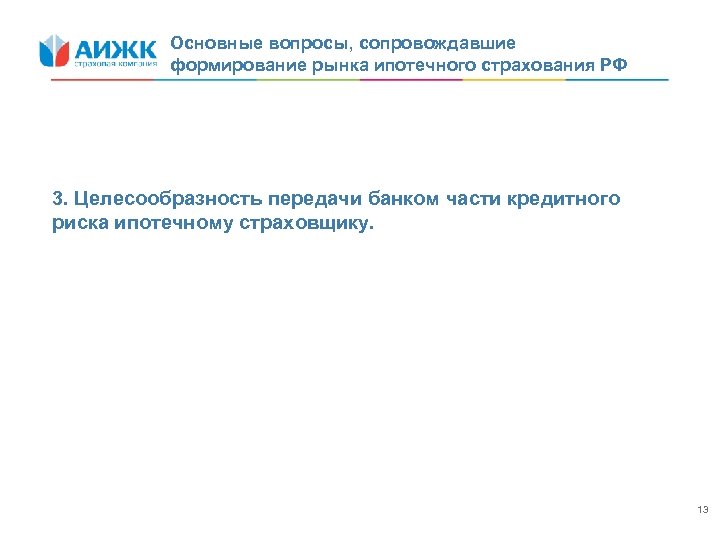 Основные вопросы, сопровождавшие формирование рынка ипотечного страхования РФ 3. Целесообразность передачи банком части кредитного риска ипотечному страховщику. 13