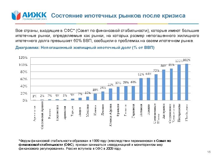 Состояние ипотечных рынков после кризиса Все страны, входящие в СФС* (Совет по финансовой стабильности), которые имеют большие ипотечные рынки, определяемые как рынки, на которых размер непогашенного жилищного ипотечного долга превышает 60% ВВП, сообщили о проблемах на своем ипотечном рынке. Диаграмма: Непогашенный жилищный ипотечный долг (% от ВВП) *Форум финансовой стабильности образован в 1999 году (впоследствии переименован в Совет по финансовой стабильности (СФС), призван заниматься «координацией и мониторингом мер финансового регулирования» . Россия вступила в СФС в 2009 году. 15