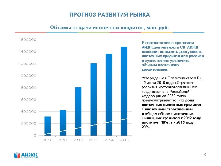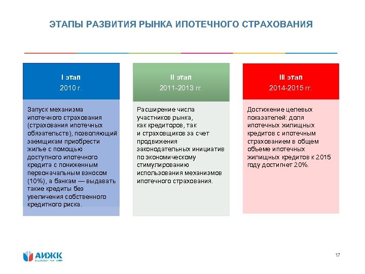 ПРОГНОЗ РАЗВИТИЯ РЫНКА Объемы выдачи ипотечных кредитов, млн. руб. В соответствии с прогнозом АИЖК деятельность СК АИЖК позволит повысить доступность ипотечных кредитов для россиян и существенно увеличить объемы ипотечного кредитования. Утвержденная Правительством РФ 19 июля 2010 года «Стратегия развития ипотечного жилищного кредитования в Российской Федерации до 2030 года» предусматривает то, что доля ипотечных жилищных кредитов с ипотечным страхованием в общем объеме ипотечных жилищных кредитов к 2012 году достигнет 10%, а к 2015 году — 20%. 16