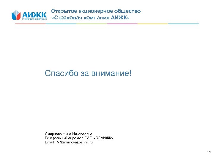 Открытое акционерное общество «Страховая компания АИЖК» Спасибо за внимание! Смирнова Нина Николаевна Генеральный директор ОАО «СК АИЖК» Email: NNSmirnova@ahml. ru 18