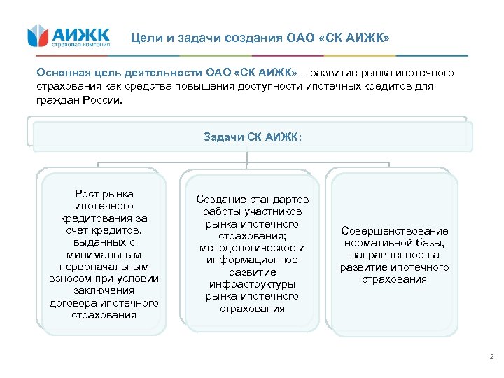 Цели и задачи создания ОАО «СК АИЖК» Основная цель деятельности ОАО «СК АИЖК» – развитие рынка ипотечного страхования как средства повышения доступности ипотечных кредитов для граждан России. Задачи СК АИЖК: Рост рынка ипотечного кредитования за счет кредитов, выданных с минимальным первоначальным взносом при условии заключения договора ипотечного страхования Создание стандартов работы участников рынка ипотечного страхования; методологическое и информационное развитие инфраструктуры рынка ипотечного страхования Совершенствование нормативной базы, направленное на развитие ипотечного страхования 2