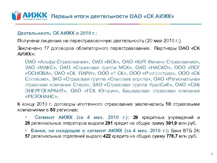 Первые итоги деятельности ОАО «СК АИЖК» Деятельность СК АИЖК в 2010 г. : Получена лицензия на перестраховочную деятельность (20 мая 2010 г. ). Заключено 17 договоров облигаторного перестрахования. Партнеры ОАО «СК АИЖК» : ОАО «Альфа-Страхование» , ОАО «ВСК» , ОАО «КИТ Финанс Страхование» , ЗАО «МАКС» , ОАО «Страховая группа МСК» , ОАО «НАСКО» , ООО «ПСГ «ОСНОВА» , ОАО «СК ПАРИ» , ООО « 1 СК» , ООО «Росгосстрах» , ООО «СК Согласие» , ЗАО «Страховая группа «Спасские ворота» , ОАО «Региональная страховая компания Стерх» , ЗАО «Страховая группа Урал. Сиб» , ОАО «САК ЭНЕРГОГАРАНТ» , ОАО «ГСК Югория» , Башкирская страховая компания «РЕЗОНАНС» . К концу 2010 г. договоры ипотечного страхования заключались 10 страховыми компаниями в 60 регионах: • Сегмент АИЖК (за 4 мес. 2010 г. ): 29 кредитных учреждений и 26 региональных операторов выдали 291 кредит на общую сумму 391, 9 млн руб. • Банки, не входящие в сегмент АИЖК (за 4 мес. 2010 г. ): Банк ВТБ 24: 57 региональных отделений выдало 422 кредита на общую сумму 776, 7 млн руб. 3