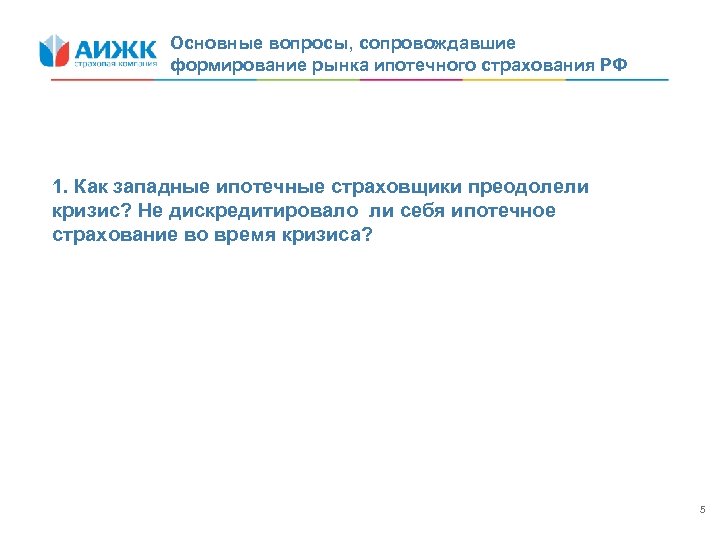 Основные вопросы, сопровождавшие формирование рынка ипотечного страхования РФ 1. Как западные ипотечные страховщики преодолели кризис? Не дискредитировало ли себя ипотечное страхование во время кризиса? 5
