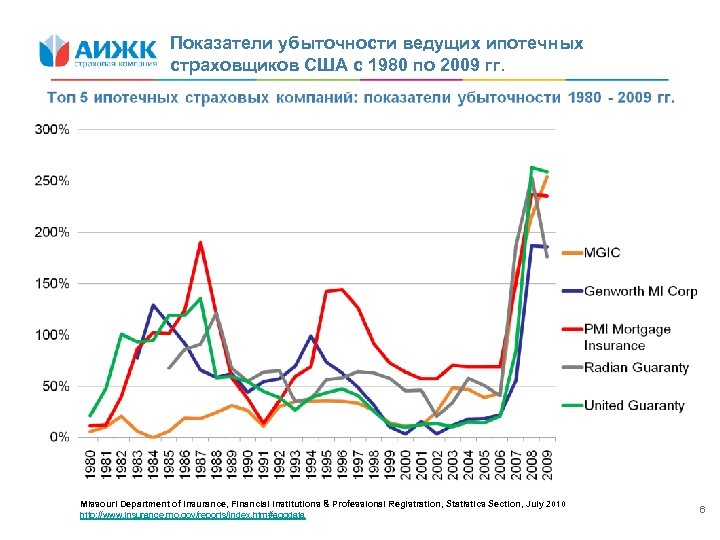 Показатели убыточности ведущих ипотечных страховщиков США с 1980 по 2009 гг. Missouri Department of Insurance, Financial Institutions & Professional Registration, Statistics Section, July 2010 http: //www. insurance. mo. gov/reports/index. htm#aggdata 6