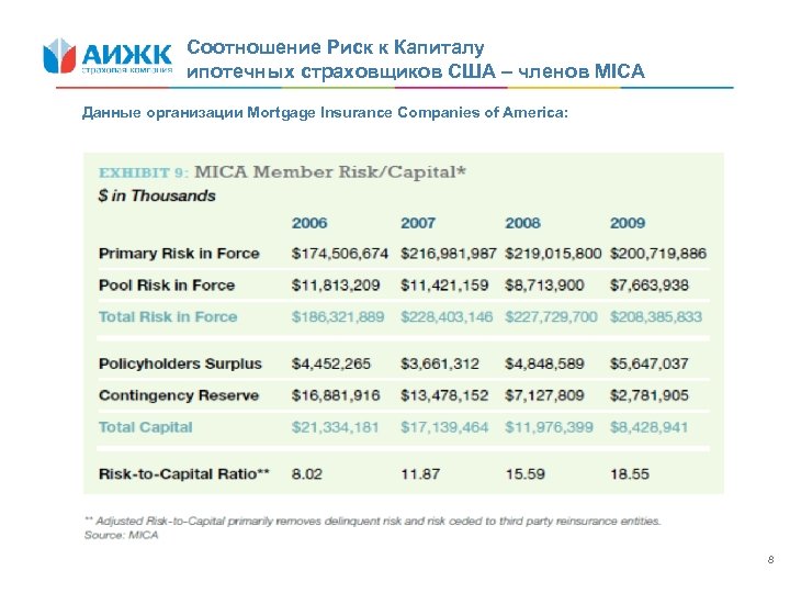 Соотношение Риск к Капиталу ипотечных страховщиков США – членов MICA Данные организации Mortgage Insurance Companies of America: 8