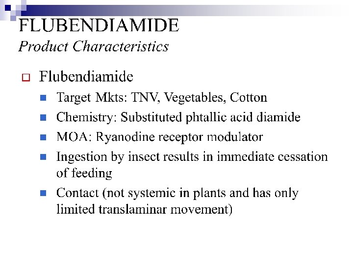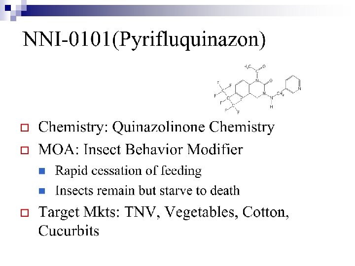Insects Controlled n n n Hemiptera, Coleoptera, Diptera, Lepidoptera, Thysanoptera, and Acarina Poisoning by ingestion; contact activity; antifeeding activity against leps Target Crops: ¨ Vegetables, Cucurbits, Cole Crops ¨ Fruits & Nuts ¨ Selected row crops ¨ Ornamentals
