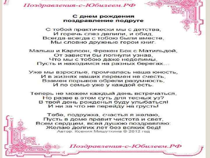 Дорогая моя, любимая моя, подруга! Я от всей души поздравляю тебя с Днем твоего Рождения! Сегодня, когда ты посмотришь вокруг себя, - ты увидишь тех, кому ты небезразлична, - тех, кто пришел поздравить тебя, потому что ценит тебя и любит! Дорожи этими людьми, ведь настоящие друзья встречаются нам не так часто! Пусть их улыбки согревают тебя в трудную минуту, пусть их слова вселяют надежду в твое сердце, что все у тебя будет просто замечательно! Счастья тебе, моя милая, любви, здоровья, радости , побольше веселья как у нас с тобой и происходит, успехов в работе и в личной жизни(ну ты поняла » про парня» ) , что бы ты оставалась такой же смешной, забавной и всегда веселой. И НЕ ЗАБЫВАЙ О НАШИХ НОЧАХ И СМЕХА ДО УТРА.