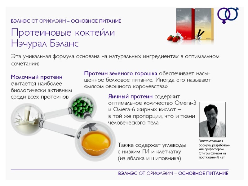 Коктейль «Нэчурал Баланс» УНИКАЛЬНОСТЬ Разработан, исследован и протестирована всемирно известными учеными из Швеции Оптимальное сочетание Омега-3 и Омега-6 жирных кислот Три источника натуральных протеинов с оптимальным составом аминокислот Только натуральные ингредиенты и ароматизаторы; не содержит ГМО Источник натуральной клетчатки; низкий гликемический индекс Натуральные ингредиенты: Омега-3 и Омега-6 из яиц Молочный протеин Протеин зеленого горошка Шиповник Яблоки Клетчатка сахарной свеклы Безопасен и эффективен – клинически доказано Произведено в соответствии с высокими стандартами производства пищевых продуктов (HACCP)
