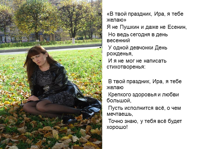 «В твой праздник, Ира, я тебе желаю» Я не Пушкин и даже не Есенин, Но ведь сегодня в день весенний У одной девчонки День рожденья, И я не мог не написать стихотворенья: В твой праздник, Ира, я тебе желаю Крепкого здоровья и любви большой, Пусть исполнится всё, о чем мечтаешь, Точно знаю, у тебя всё будет хорошо!