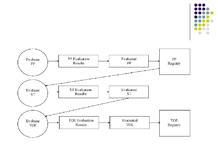 l l Replaced TCSEC, ITSEC 7 Evaluation Levels (functionally tested to formally designed and tested) Functional requirements, assurance requirements and evaluation methodology Functional and assurance requirements are organized hierarchically into: class, family, component, and, element. The components may have dependencies.