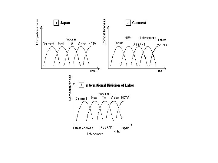 • Intra-industry aspect: product development within a particular developing country, with a single industry growing over three time-series curves, i. e. , import (M), production (P), and export (E). • Inter-industry aspect: sequential appearance and development of industries in a particular developing country, with industries being diversified and upgraded from consumer goods to capital goods and/or from simple to more sophisticated products. • International aspect: subsequent relocation process of industries from advanced to developing countries during the latter's catching-up process.