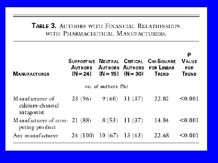 Does conflict of interest matter? • Is there a relationship between whether authors are supportive of the use of calcium channel antagonists and whether they have a financial relationship with the manufacturers of the drugs? • Stelfox HT, Chua G, O'Rourke K, Detsky AS. Conflict of interest in the debate over calcium channel antagonists. N Engl J Med 1998; 338: 101105