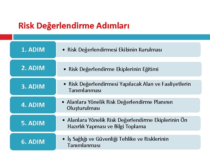 ADIML Risk Değerlendirme Adımları 1. ADIM • Risk Değerlendirmesi Ekibinin Kurulması 2. ADIM • Risk Değerlendirme Ekiplerinin Eğitimi 3. ADIM • Risk Değerlendirmesi Yapılacak Alan ve Faaliyetlerin Tanımlanması 4. ADIM • Alanlara Yönelik Risk Değerlendirme Planının Oluşturulması 5. ADIM • Alanlara Yönelik Risk Değerlendirme Ekiplerinin Ön Hazırlık Yapması ve Bilgi Toplama 6. ADIM • İş Sağlığı ve Güvenliği Tehlike ve Risklerinin Tanımlanması