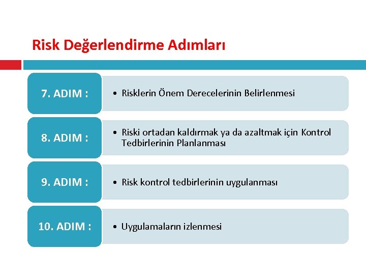 Risk Değerlendirme Adımları 7. ADIM : • Risklerin Önem Derecelerinin Belirlenmesi 8. ADIM : • Riski ortadan kaldırmak ya da azaltmak için Kontrol Tedbirlerinin Planlanması 9. ADIM : • Risk kontrol tedbirlerinin uygulanması 10. ADIM : • Uygulamaların izlenmesi