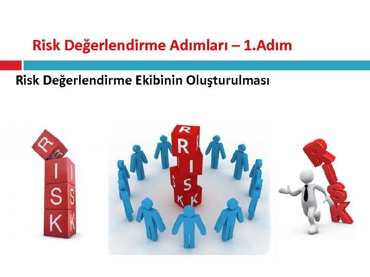 Risk Değerlendirme Adımları – 2. Adım 2. ADIM: Risk değerlendirme Ekiplerinin Eğitimi Her bir Risk Değerlendirme Ekibinden beklenen kendi sorumluluk alanlarının ve bu alanlarda yapılan faaliyetlerin iş sağlığı ve güvenliği ile ilgili tehlike ve risklerinin tanımlanması, tanımlanan risklerin önem derecelerinin belirlenmesi ve bu risklere karşı mevcut kontrol tedbirlerinin varlığının ve yeterliliğinin değerlendirilmesidir.