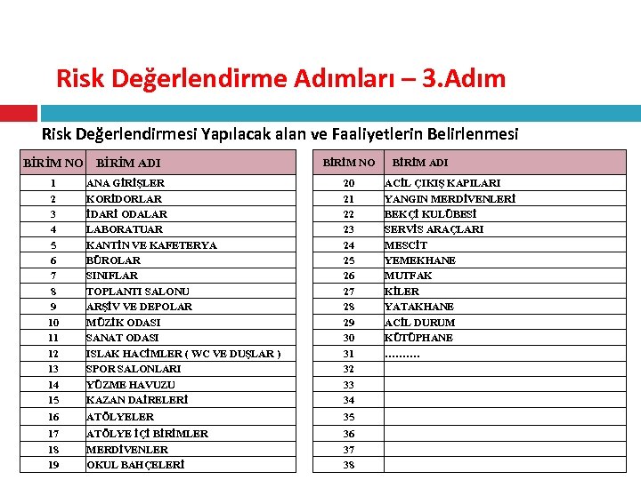 Risk Değerlendirme Adımları – 3. Adım Risk Değerlendirmesi Yapılacak alan ve Faaliyetlerin Belirlenmesi BİRİM NO BİRİM ADI BİRİM NO 1 2 3 4 5 6 7 8 9 10 11 12 13 14 15 ANA GİRİŞLER KORİDORLAR İDARİ ODALAR LABORATUAR KANTİN VE KAFETERYA BÜROLAR SINIFLAR TOPLANTI SALONU ARŞİV VE DEPOLAR MÜZİK ODASI SANAT ODASI ISLAK HACİMLER ( WC VE DUŞLAR ) SPOR SALONLARI YÜZME HAVUZU KAZAN DAİRELERİ 20 21 22 23 24 25 26 27 28 29 30 31 32 33 34 16 ATÖLYELER 35 17 18 19 ATÖLYE İÇİ BİRİMLER MERDİVENLER OKUL BAHÇELERİ 36 37 38 BİRİM ADI ACİL ÇIKIŞ KAPILARI YANGIN MERDİVENLERİ BEKÇİ KULÜBESİ SERVİS ARAÇLARI MESCİT YEMEKHANE MUTFAK KİLER YATAKHANE ACİL DURUM KÜTÜPHANE ……….