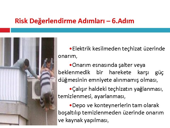 Risk Değerlendirme Adımları – 6. Adım • Elektrik kesilmeden teçhizat üzerinde onarım, • Onarım esnasında şalter veya beklenmedik bir harekete karşı güç düğmesinin emniyete alınmamış olması, • Çalışır haldeki teçhizatın yağlanması, temizlenmesi, ayarlanması, • Depo ve konteynerlerin tam olarak boşaltılıp temizlenmeden üzerinde onarım ve kaynak yapılması,