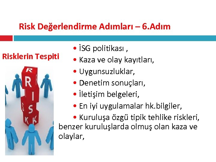 Risk Değerlendirme Adımları – 6. Adım Risklerin Tespiti • İş Sağlığı ve İş Güvenliği’ne ilişkin hukuki ve diğer şartlar (mevzuat), • Ön gözden geçirme sonuçları, • Çalışanlar ve diğer ilgili taraflardan alınan bilgiler, • Çalışanlardan elde edilen İSG bilgileri, işyerindeki gözden geçirme ve iyileştirme faaliyetleri (bu faaliyetler özelliği itibariyle reaktif ya da proaktif olabilir)
