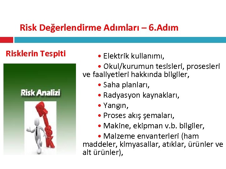 Risk Değerlendirme Adımları – 6. Adım Risklerin Tespiti • Elektrik kullanımı, • Okul/kurumun tesisleri, prosesleri ve faaliyetleri hakkında bilgiler, • Saha planları, • Radyasyon kaynakları, • Yangın, • Proses akış şemaları, • Makine, ekipman v. b. bilgiler, • Malzeme envanterleri (ham maddeler, kimyasallar, atıklar, ürünler ve alt ürünler),