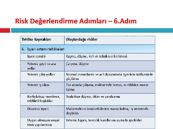 Risk Değerlendirme Adımları – 6. Adım 5 -İşyeri Ortamından Kaynaklanan Tehlikeler: • İşyeri zemini, • Yetersiz geçitler, • Yetersiz çıkış yerleri, • Yetersiz iş alanı, • Düzensiz işyeri, • Merdivenlerde korkuluk olmaması, • Duşların ve tuvaletlerin çalışır durumda veya temiz olmaması,