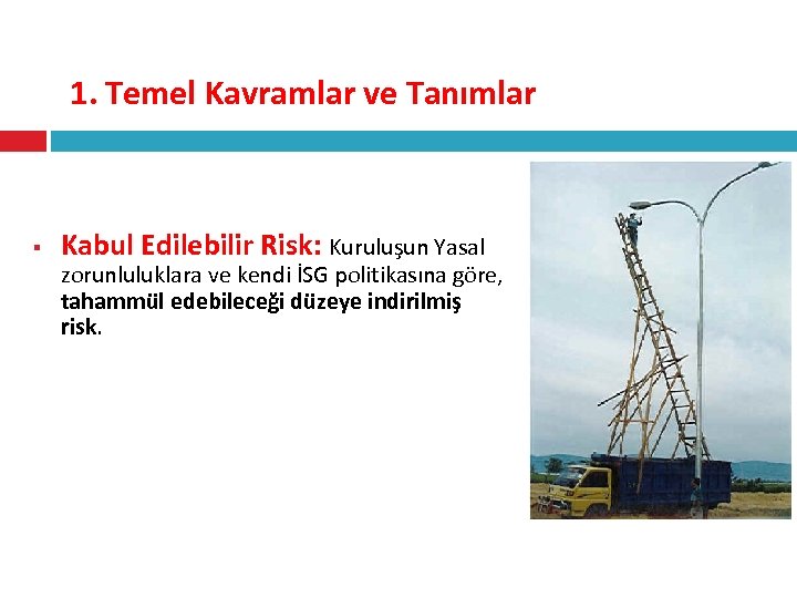 1. Temel Kavramlar ve Tanımlar § Kabul Edilebilir Risk: Kuruluşun Yasal zorunluluklara ve kendi İSG politikasına göre, tahammül edebileceği düzeye indirilmiş risk.