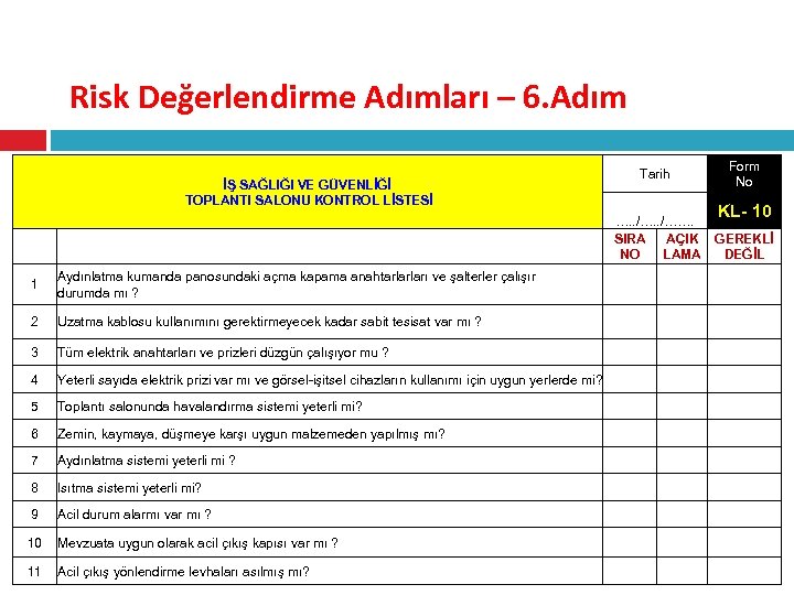 RİSK DEĞERLENDİRİLMESİ Risk Değerlendirme Adımları – 6. Adım Form No Tarih İŞ SAĞLIĞI VE GÜVENLİĞİ TOPLANTI SALONU KONTROL LİSTESİ KL- 10 …. . /……. SIRA AÇIK GEREKLİ NO LAMA DEĞİL 1 Aydınlatma kumanda panosundaki açma kapama anahtarlarları ve şalterler çalışır durumda mı ? 2 Uzatma kablosu kullanımını gerektirmeyecek kadar sabit tesisat var mı ? 3 Tüm elektrik anahtarları ve prizleri düzgün çalışıyor mu ? 4 Yeterli sayıda elektrik prizi var mı ve görsel-işitsel cihazların kullanımı için uygun yerlerde mi? 5 Toplantı salonunda havalandırma sistemi yeterli mi? 6 Zemin, kaymaya, düşmeye karşı uygun malzemeden yapılmış mı? 7 Aydınlatma sistemi yeterli mi ? 8 Isıtma sistemi yeterli mi? 9 Acil durum alarmı var mı ? 10 Mevzuata uygun olarak acil çıkış kapısı var mı ? 11 Acil çıkış yönlendirme levhaları asılmış mı?